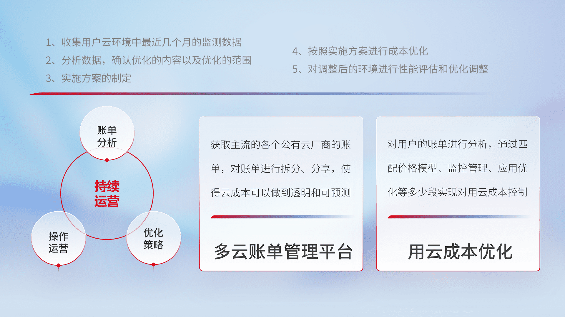 通过多云纳管,,以统一的资源数据模型把客户的云资源进行抽象和封装,,进而实现对多云资源的统一操作,,保障云资源管理的可靠性、、、稳定性与可用性。。。。量身定制化运维内容,,,,配置、、、开发运维、、、、补丁管理、、、备份、、监控、、、、认证和访问管理、、、审计和日常巡检等,,,,保障在用云过程中的可靠度,,,,稳定度以及高可用率。。